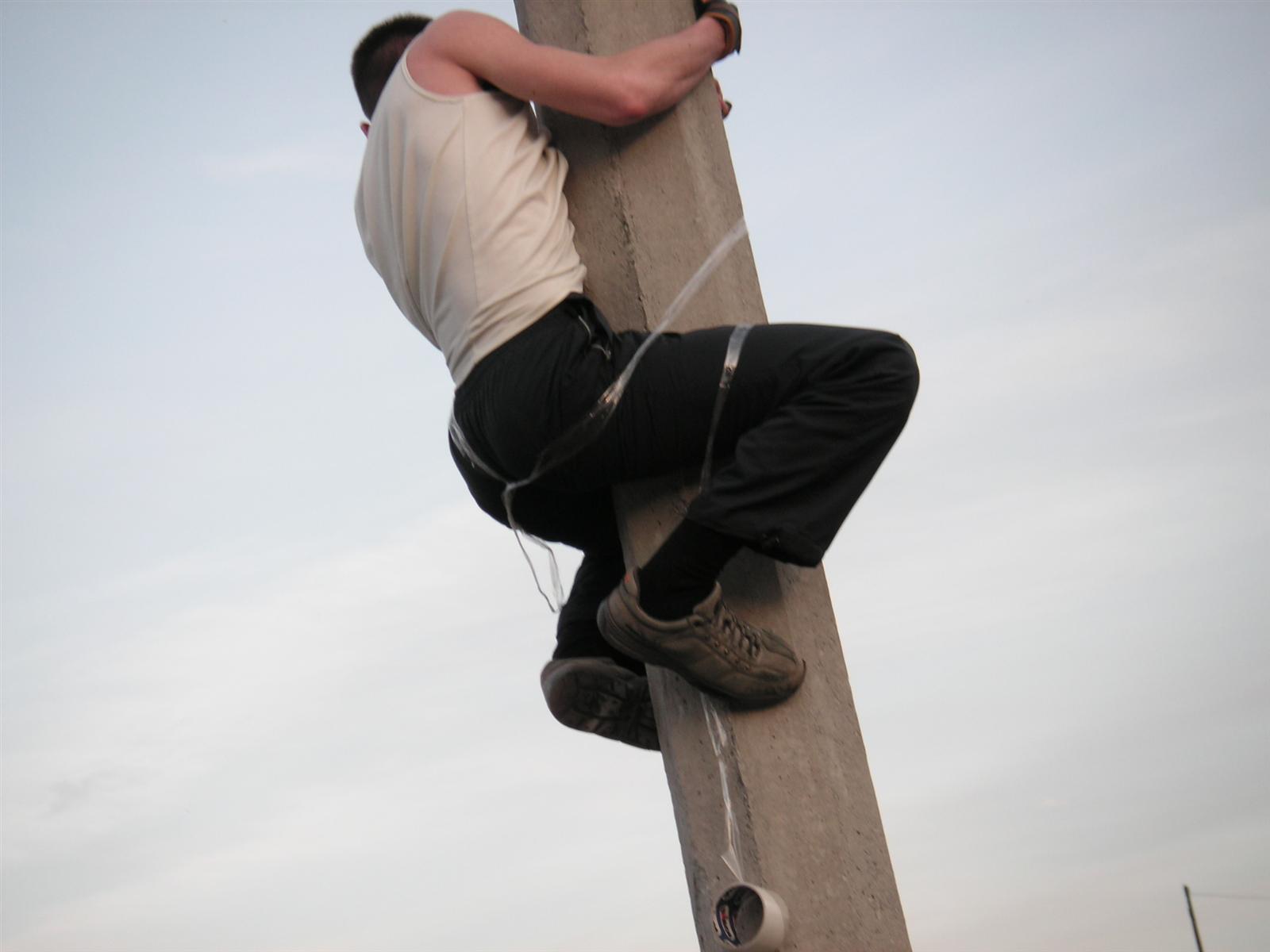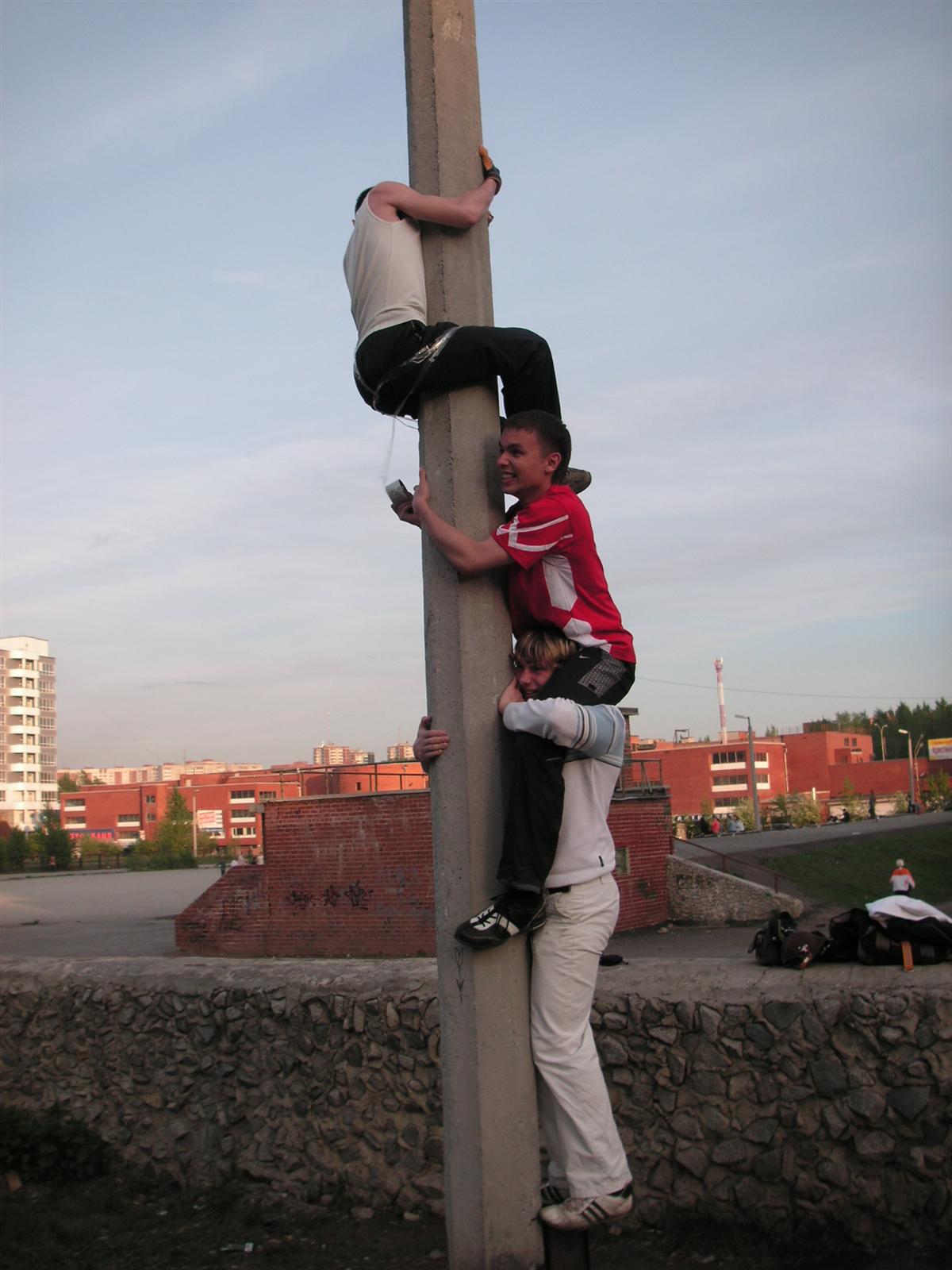 Влад боялся, что его тоже примотают скотчем к столбу - и залез на столб... это его не спасло - мы его достали :)