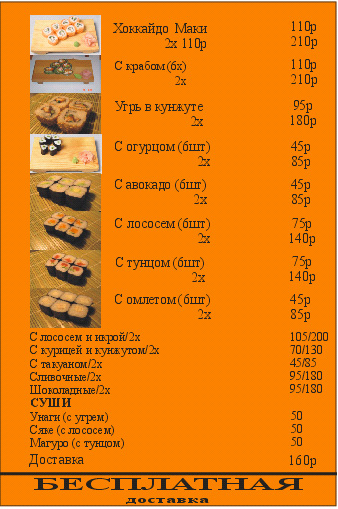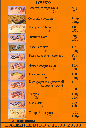 Планета маки (огурец, лосось, тамаго, такуан) 1 порция (4 штуки) - 70 рублей 2 порции - 130 рублей